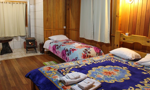 Até a calefação dos quartos segue os costumes da região. Cada cabana tem seu próprio fogão a lenha, feito de ferro. O proprietário acendeu o nosso assim que chegamos.